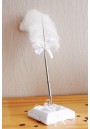 Le stylo à une plume en son extrémité entre le stylo argenté et la plume un noeud satiné blanc à pour centre une perles strass.