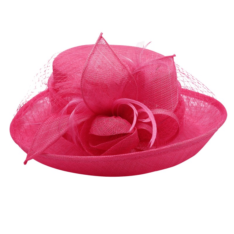 - Ce chapeau en sisal Ivoire, Gris, Rose Corail, Rose Fushia, Marron light, Noir ou Jaune/Vert ce compose d'une fleur en forme de bouton d'or de couleur assortie au chapeau, très élégant et agréable à porter, il est également accompagné de plumes et d'un filet voilette sur le devant .