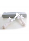 - Couverts à gâteaux de mariage modèle "princesse" composés d'un couteau et d'une pelle à tarte de couleur blanc. Cet ensemble est ultra chic grâce aux manches recouverts entièrement de perles et de strass avec a la base des lames un nœud en satin avec en son centre un cœur.