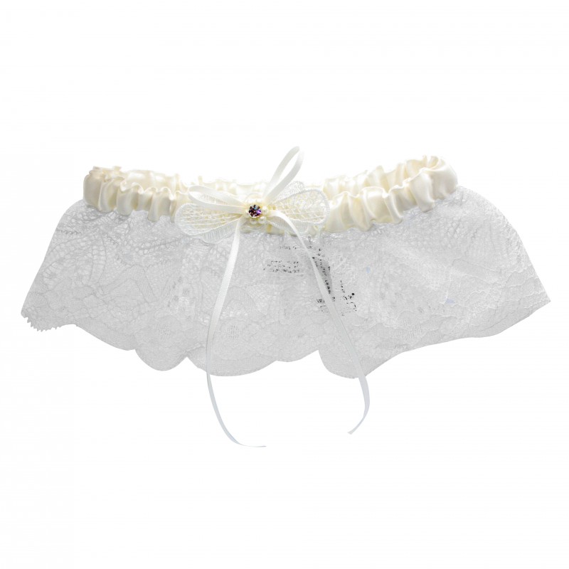 - Jarretière pour mariée en dentelle blanc à motif floral, elle est agrémentée d'un ruban formant un noeud munie d'une fleur en strass sur le milieu de couleur ivoire. Jarretière à enfilée.