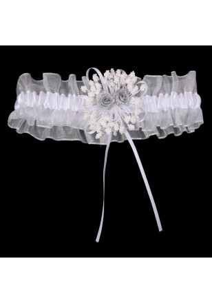 - Jarretière pour mariée en voile simple blanc, elle est agrémentée d'un ruban en satin formant un noeud incrusté d'une fleur argenté et de pistils sur le milieu. Jarretière à enfilée.