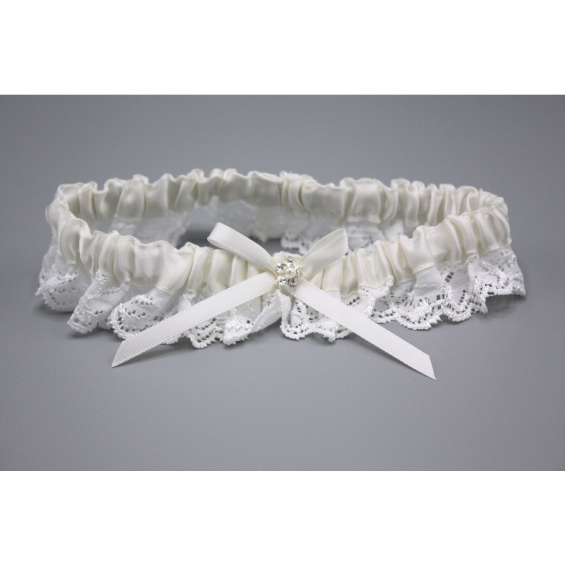 - Jarretière pour mariée en dentelle ivoire muni d'une dentelle transparent sur le bas, elle est agrémentée d'un ruban en satin formant un noeud incrusté de strass et munie d'une perle sur le milieu. Jarretière à enfilée.