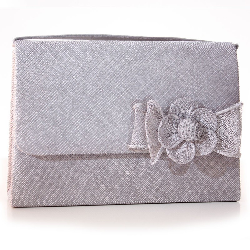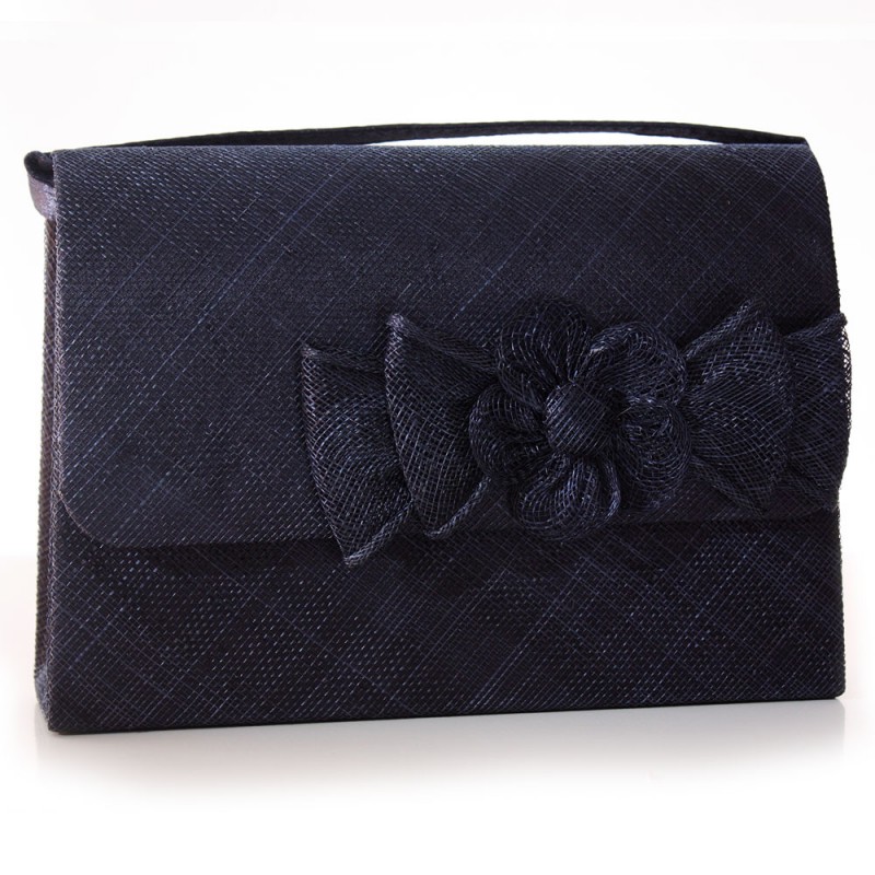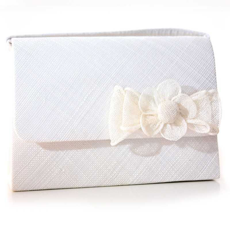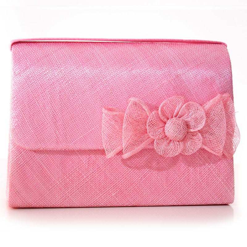 - Sac pochette de mariage en sinamay Ivoire, Bleu Turquoise, Bleu Marine, Noir, Rose Corail, Rose Fushia, Rose Pal, Gris, Beige ou Rouge ayant une ouverture agrémenté d'une fleur bouton sur le côté droit.